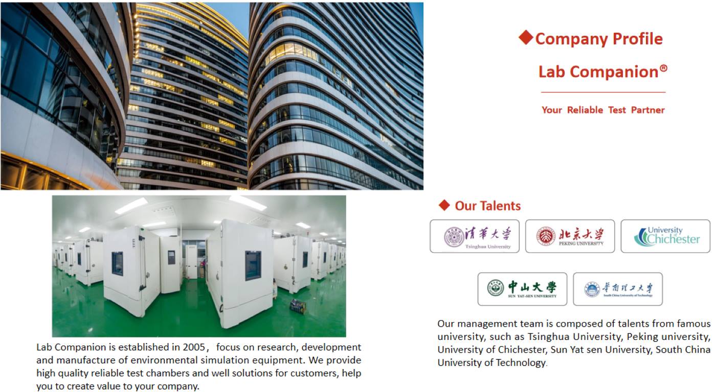 LAB COMPANION TERBATAS didirikan pada tahun 2005 dan telah berkomitmen pada R & D, manufaktur, dan penjualan peralatan uji keandalan lingkungan selama 20 tahun. Puluhan ribu pelanggan di seluruh dunia memilih untuk menggunakan produk Lab Companion di laboratorium dan jalur produksi mereka untuk pengujian mobil, energi baru, semikonduktor, komunikasi, produk elektromekanis, kedirgantaraan, material baru, dan produk lainnya dengan cara yang lebih hemat energi, akurat, dan efisien. Dengan meningkatkan kualitas dan keandalan produk, kami dapat mengurangi produk yang gagal, sehingga lingkungan dapat terus berkembang lebih baik!
