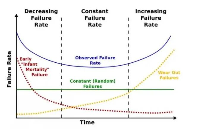 Distribusi siklus hidup pengoperasian sejumlah perangkat dapat dimodelkan sebagai kurva bak mandi, jika kegagalan diplot pada sumbu y terhadap masa operasi pada sumbu x. Kurva bak mandi menunjukkan bahwa tingkat kegagalan tertinggi yang dialami oleh sejumlah perangkat terjadi selama tahap awal siklus hidup, atau awal masa pakai, dan selama periode keausan siklus hidup. Antara tahap awal masa pakai dan tahap keausan terdapat periode panjang di mana perangkat mengalami kegagalan yang sangat jarang.