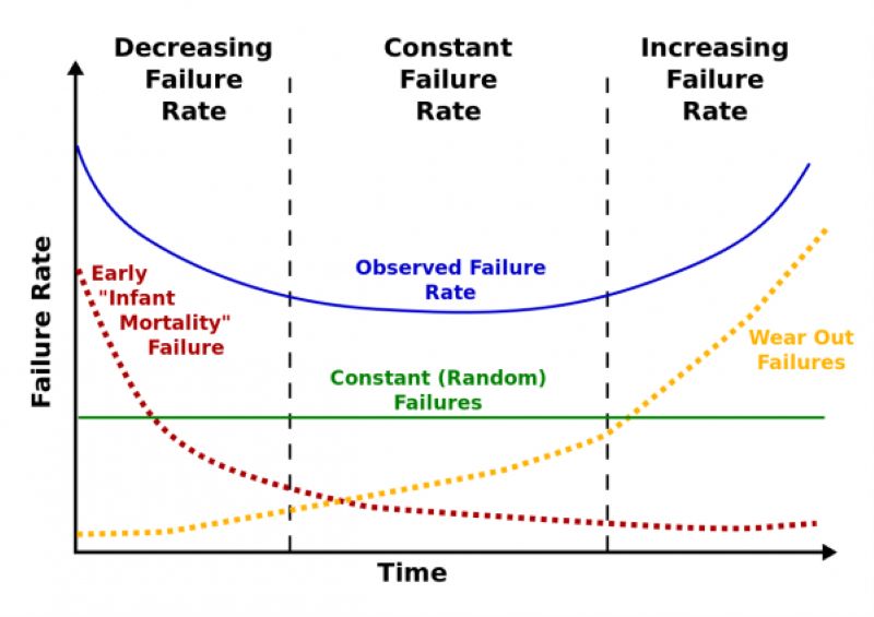 Distribusi siklus hidup pengoperasian sejumlah perangkat dapat dimodelkan sebagai kurva bak mandi, jika kegagalan diplot pada sumbu y terhadap masa operasi pada sumbu x. Kurva bak mandi menunjukkan bahwa tingkat kegagalan tertinggi yang dialami oleh sejumlah perangkat terjadi selama tahap awal siklus hidup, atau awal masa pakai, dan selama periode keausan siklus hidup. Antara tahap awal masa pakai dan tahap keausan terdapat periode panjang di mana perangkat mengalami kegagalan yang sangat jarang.