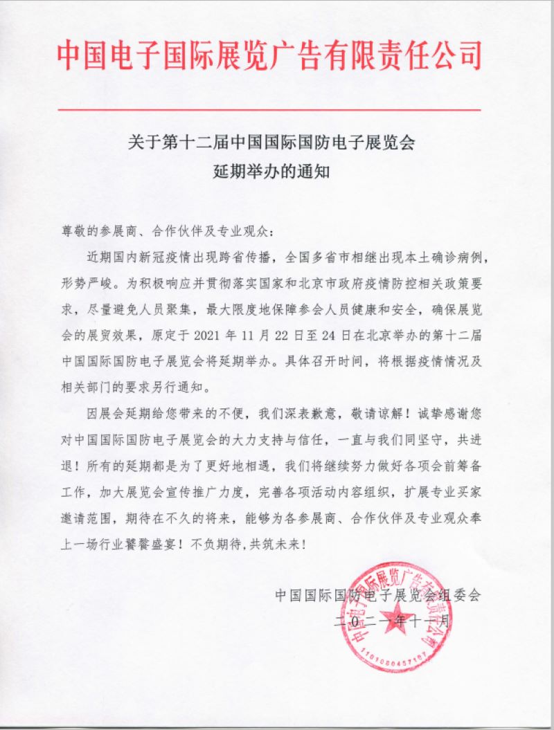 Mengingat kompleksitas dan ketidakpastian epidemi saat ini, dan dalam semangat bertanggung jawab terhadap para peserta pameran, telah diputuskan melalui diskusi antara otoritas terkait dan panitia penyelenggara bahwa Pameran Elektronik Pertahanan akan ditunda.