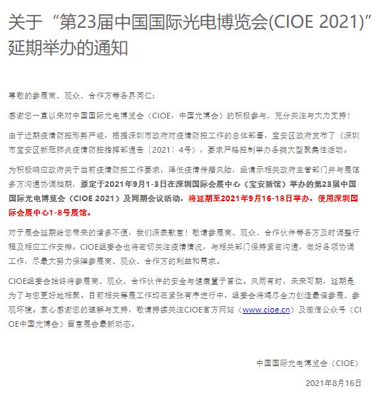 Pameran Optoelektronik Internasional China ke-23 tahun 2021 (CIOE 2021) akan ditunda.