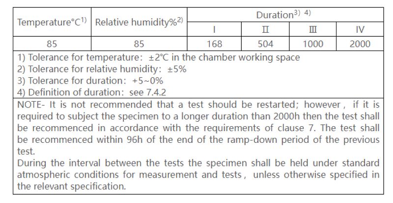 WHTOL (Wet High Temperature Operating Life) adalah uji percepatan tegangan lingkungan yang umum, biasanya 85℃ dan kelembapan relatif 85%, yang umumnya dilakukan sesuai dengan standar IEC 60068-2-67-2019. Kondisi pengujian ditunjukkan dalam bagan.
