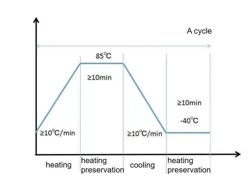 Siklus termal naik dan turun pada laju minimal 10 °C/menit, dan pada dua titik suhu 85 °C dan -40 °C, siklus tersebut harus berlangsung cukup lama agar perangkat mencapai suhu ruangan. Untuk modul optik dalam ruangan, 100 siklus sudah cukup, dan untuk modul optik luar ruangan, diperlukan 500 siklus. Untuk modul dengan kontrol suhu TEC, biarkan TEC tetap menyala selama siklus termal.